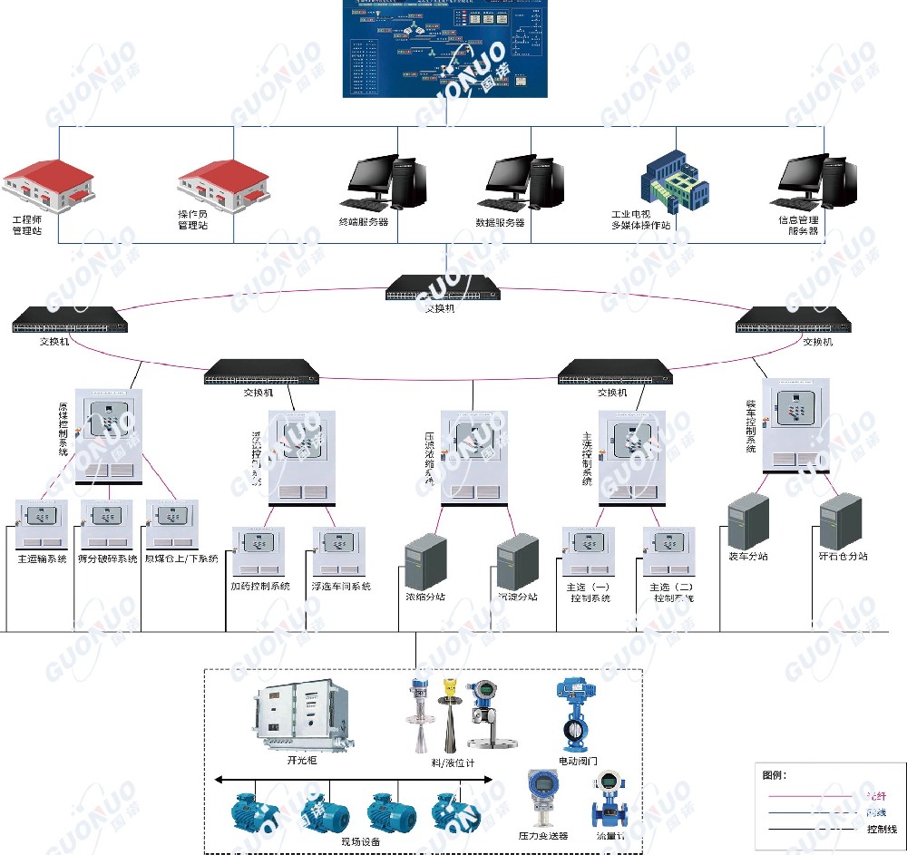 煤礦地面生產(chǎn)系統(tǒng)集中控制系統(tǒng)通常由以下幾個子系統(tǒng)組成:生產(chǎn)集中控制子系統(tǒng)?、重介密度子系統(tǒng)?、調度通信子系統(tǒng)?、煤礦圖像監(jiān)視系統(tǒng)?、計算機信息管理子系統(tǒng)?。負責全廠生產(chǎn)工藝設備控制、工藝數(shù)據(jù)監(jiān)測控制、設備工況監(jiān)測控制、信息管理、工業(yè)電視監(jiān)視及生產(chǎn)調度指揮。