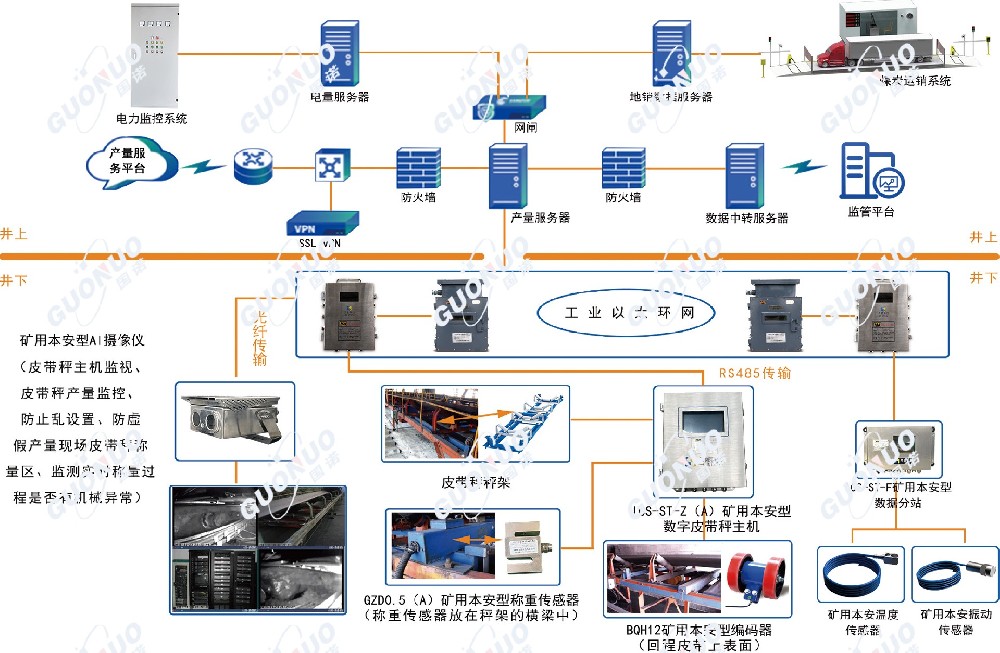 該系統(tǒng)主要由礦用隔爆兼本安型皮帶秤主機(jī)、礦用稱重傳感器、礦用速度傳感器、礦用本安型攝像機(jī)、礦用本安型數(shù)據(jù)分站、礦用本安溫度傳感器、礦用本安振動傳感器、礦用防爆交換機(jī)以及《煤礦產(chǎn)量遠(yuǎn)程監(jiān)控系統(tǒng)》軟件系統(tǒng)等組成。